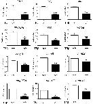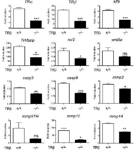 Fig. 4. T3 response genes fail to be upregulated in the intestine of TRβ knockout tadpoles during metamorphosis. Total RNA was isolated from the intestine of wild type and TRβ knockout tadpoles at stage 54 treated with or without 10 nM T3 for 18 h and used for real-time RT-PCR analysis of the expression of TRα and known T3 direct target genes: TRβ, klf9, and TH/bzip; genes related to ECM remodeling: mmp2, mmp9, mmp11, and mmp14; apoptosis-related genes: caspase 3 (casp3) and caspase 9 (casp9); and cell dedifferentiation-related genes: ror2 and wnt5a. The mRNA levels were normalized against that of rpl8. The groups included 5 wild type and 5 TRβ homozygous [TRβ(â/â)] animals. Note that T3 upregulated the expression of nearly all genes in the wild type animals but this upregulation was drastically reduced or abolished in the knockout animals. Asterisks (*, ** and ***) indicate a significant difference vs wild type as determined by student-t test (Pâ<â0.05, Pâ<â0.01 and Pâ<â0.001). ns no significant difference |