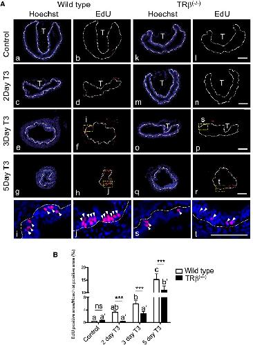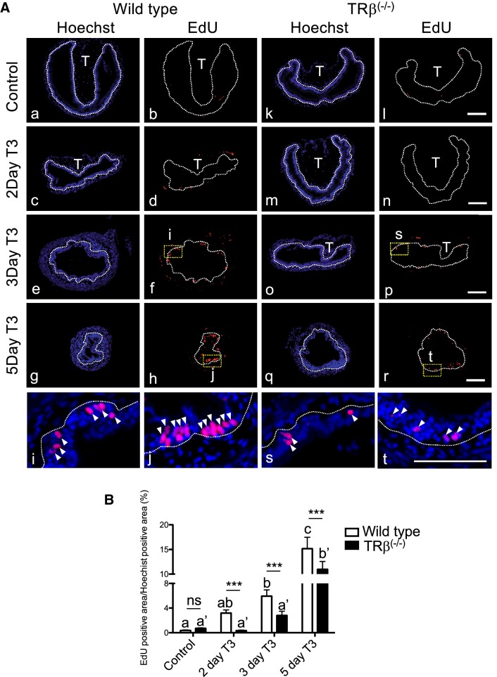 Fig. 6. Knocking out of TRβ tadpoles reduces intestinal stem cell proliferation during T3-induced metamorphosis. A Reduced EdU labeling in TRβ knockout tadpoles after T3 treatment. Wild type (aâj) and TRβ knockout (kât) tadpoles at stage 54 were treated with or without 5 nM T3 treatment for up to 5 days. The animals were injected with EdU solution for 30 min before being sacrificed. Cross-sections of the intestine were prepared and stained with Hoechst 33342 for DNA and EdU for proliferating cells. The dotted lines depict the epithelium-mesenchyme boundary, drawn based on morphological differences between epithelial cells and mesenchyme cells in the pictures of the stained tissues, under enhanced contrast and/or brightness by using Photoshop, if needed. Dashed yellow boxes (f, h, p and r) indicate the higher magnification (i, j, s and t), respectively. EdU: red, and Hoechst: blue. T: typhlosole. At least 3 tadpoles were analyzed for each genotype. Bars: 100 µm. B EdU positive area was reduced in the intestine of TRβ homozygous knockout animals. The EdU positive area in A was quantified and normalized against the Hoechst 33342 positive area. Different lower case letters denote statistically significant differences (Pâ<â0.05) when compared in a single genotype and asterisks (***) indicate a significant difference between the two genotypes (Pâ<â0.001). ns no significant difference |