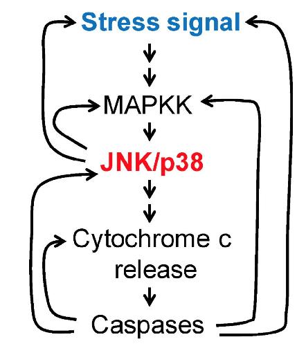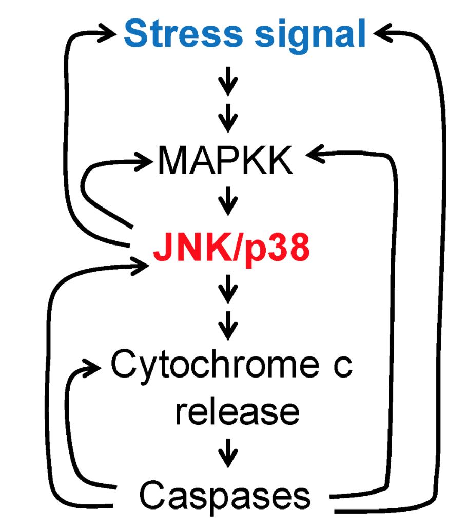 Figure 5. MAPKs in apoptosis: A simplified model. An input, represented by a stress signal (Ca2+, ROS, osmotic shock, death receptor, etc.), will activate a MAPK cascade, which in turn feedbacks on the initial input/cascade to achieve higher MAPK activation. After a threshold of MAPK activation is surpassed, additional downstream targets are activated, promoting cytochrome c release and caspase activation. Other positive feedback loops, engaged downstream of MAPKs, will keep sustained and high levels of activation of JNK/p38 and caspases, assuring the irreversibility of the apoptotic process. |
