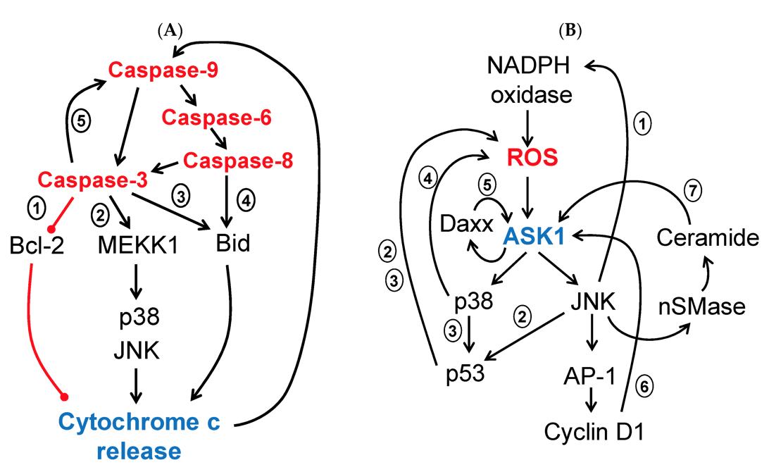 Tobiume, ASK1 is required for sustained activations of JNK/p38 MAP kinases and apoptosis. 2001, Pubmed