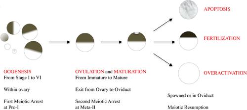 Figure 1. Life cycle events of oocytes and eggs in Xenopus laevis: from its cradle (oogenesis in ovary) through ovulation and maturation to physiological (sperm‐dependent initiation of zygotic development, ie, fertilization) or pathological ending (spontaneous activation‐mediated death by apoptosis or overactivation)