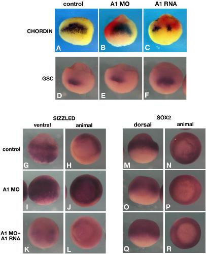 Fig. 2. Apcdd1 regulates expression of both positive and negative targets of BMP signaling in Xenopus embryos. In situ hybridization of morpholino-depleted (A1MO), or Apcdd1 overexpressing embryos. Embryos were injected at the 4-cell stage dorsally (A-C, double in situ hybridization for chordin and LacZ RNA as injection marker, in red), or 1 âcell stage (DâR). Control embryos were injected solely with LacZ RNA (1 âng). A-F. Spemann organizer genes: chordin is not affected by apcdd1 depletion (B) (n â= â18 embryos), but inhibited by apcdd1 RNA (A1 RNA) overexpression (n â= â23 embryos), consistent with the inhibition of the maternal, dorsal Wnt pathway; gsc is unaffected by either treatment (n â= â15 and n â= â12 embryos, respectively, E, F). G-L. The ventral marker and BMP target sizzled is expanded by Apcdd1 depletion (n â= â23, I, J), and restored by expression of a MO-resistant apcdd1 RNA (n â= â21 embryos, K, L). M-R. The early neural marker and negative BMP target sox2 is inhibited by Apcdd1 depletion (n â= â27 embryos, O, P, arrows in O indicate a hole in the ventral expression pattern), and partially restored by expression of Apcdd1 RNA (n â= â17 embryos, Q, R). |
