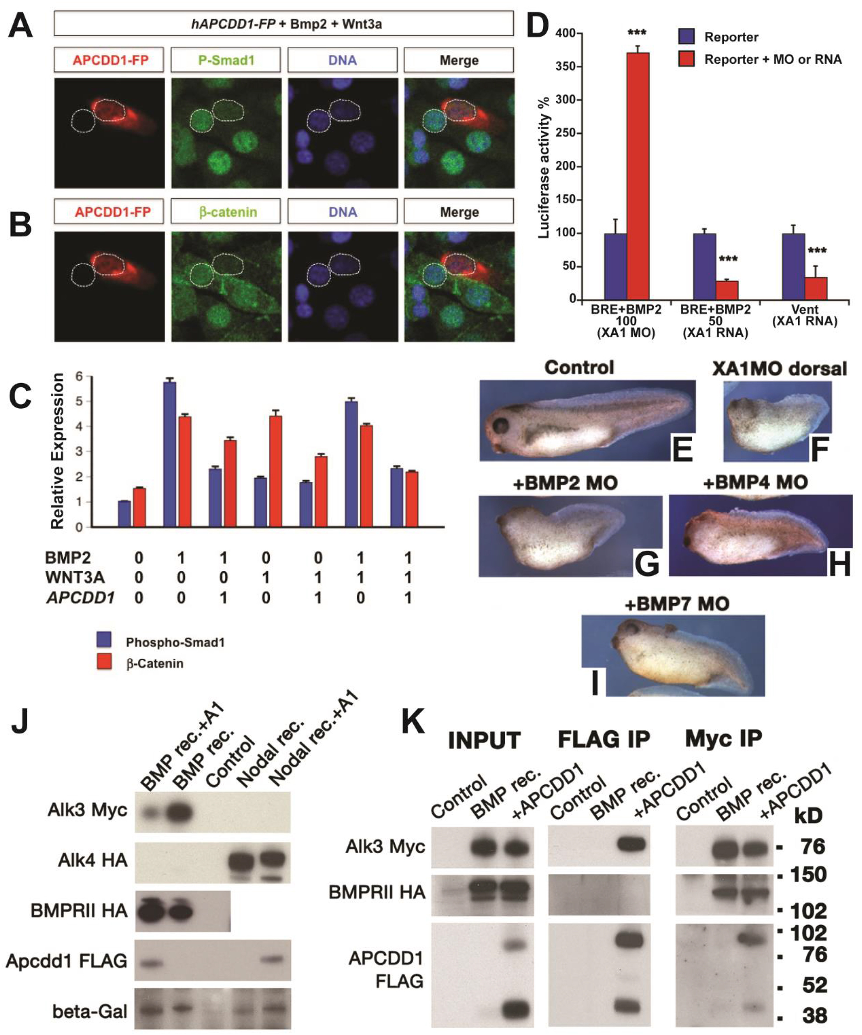 Fig. 3. APCDD1 inhibits BMP signaling in cells and tissues. A-B. The activation of BMP and Wnt pathways was measured at single-cell level, using NIH 3T3 mouse fibroblast cells cultured in the presence of BMP and Wnt ligands. Cells transfected with human APCDD1 and a fluorescence reporter (displayed in red) have low levels of both pSmad1 (green in A) and β-catenin (green in B), while neighboring cells that are not transfected have higher levels of both effectors. Nuclei are visualized with DAPI (blue). C. The immunofluorescence levels of pSmad1 and β-catenin were measured relative to the background (relative expression, Y axis), in the presence (0) or absence (1) of one or both ligands (Bmp2, Wnt3A) or of APCDD1 (n â= â40 âcells per condition). The outputs of BMP and Wnt signaling are inhibited by APCDD1 (p â< â0.001 in Bonferroni-adjusted 2-way heteroscedastic t-test comparisons). D. Effect of Xenopus Apcdd1 (XA1) modulation on BMP-induced transcriptional activity in Xenopus animal injections. Apcdd1 depletion increases transcription induced by exogenous BMP2 RNA, while overexpression of apcdd1 RNA reduces transcription from both the BRE reporter induced by exogenous BMP2, and of the Vent promoter induced by endogenous BMP ligands. âââp â< â0.001 in Studentâs t-test. Embryos were collected at stage 10.5, four embryos per assay, in triplicate, and each experiment was repeated a minimum of 3 times. E-I. The phenotype of XA1 depletion on the dorsal side is rescued most effectively by simultaneous BMP7 depletion (quantification in Fig. S1E). Embryos injected at the 4-cell stage on the dorsal side were collected at stage 36. The dorso-anterior index (DAI) values (Kao and Elinson, 1988) are: E â DAI5 (normal), F â DAI2, G â DAI2, H â DAI3, I â DAI4. For D-I, at least 10 Xenopus embryos, in three different experiments, were examined for each time point and experimental condition. J. Human APCDD1 specifically reduces the protein level of type I BMP receptor BMPRIA, but not the type II receptor BMPR2 and nodal type I receptor ACVR1B. Beta-galactosidase serves as loading control. Xenopus embryos were injected in the animal poles. K. APCDD1 interacts directly with BMPRIA, but not with BMPR2, in CHO cells. APCDD1 and BMPRIA coprecipitated in both APCDD1 (center panel) and BMPRIA (right panel) immunoprecipitation. BMPR2 coprecipitated with BMPRIA (right panel), but not with APCDD1 (center panel). |
