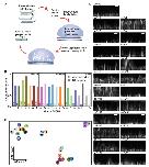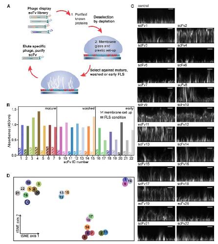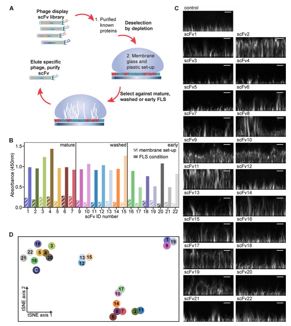 Figure 1. Phage display phenotypic screen on FLS. (A) Schematic of the screen. (B) Phage ELISA yes/no screening on selection outputs (n = 1) leading to the identification of 22 unique phage clones specific to their FLS condition with lack of binding to the bilayer and setup (hatched boxes). (C) Example images of FLS phenotypes on preaddition of 5 μl of each scFv of ∼1 mg/ml concentration to the FLS assay mix. Images are maximum intensity projections of 1 μm confocal Z stack reconstructions viewed from the side. Scale bars, 10 μm. (D) T-distributed stochastic neighbor embedding plot of the 22 scFvs and buffer control (“C”). The distance between the points shows a 2D representation of the 6D neighborhood structure spanned by each condition’s median FLS count, the median average FLS length, and the median average FLS base area, for both additional actin added and no actin added. Each scFv is color coded. |