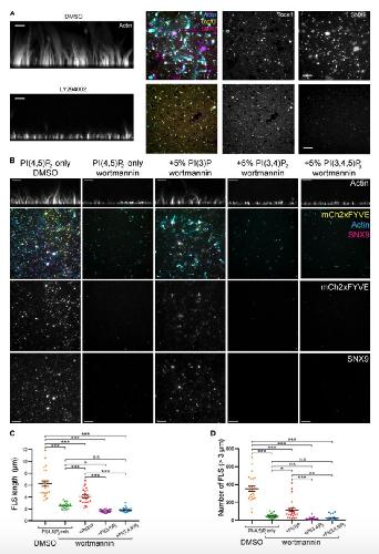 Figure 3. Class I PI3K is involved in FLS formation with PI(3)P being a key downstream lipid. (A) TIRF and confocal imaging of representative FLS regions containing labeled SNX9 (TIRF), TOCA-1 (TIRF), or actin (maximally projected confocal side or Z views) treated with DMSO or 100 μM LY294002. Both SNX9 and actin but not TOCA-1 are reduced by the inhibitor. (B) TIRF and confocal imaging of representative FLS regions containing labeled SNX9, the PI(3)P probe mCh-2xFYVE (TIRF), or actin (maximally projected confocal side or Z views) grown on membranes containing 10% PI(4,5)P2 or 10% PI(4,5)P2 plus 5% PI(3)P, 5% PI(3,4)P2 or 5% PI(3,4,5)P3 and treated with either DMSO or 2 μM wortmannin. SNX9, mCh-2xFYVE, and actin are reduced on wortmannin treatment. Inclusion of 5% PI(3)P shows mCh-FYVE labeling and SNX9 recruitment in the presence of wortmannin and 5% PI(3,4)P2 or 5% PI(3,4,5)P3 do not. (C and D) Quanti- fication of data in B. Each datapoint represents an individual imaging region (n = 24 regions for each treatment from two independent experiments). Lines indicate mean ± SEM. Statistical significance was assessed by ordinary one-way ANOVA with HolmâSidakâs multiple comparisons test (Table S2). Scale bars, 10 μm. n.s., not significant. |
