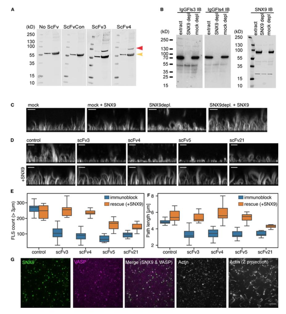 Figure 2. Identification of SNX9 as the antigen to antibodies giving a shorter FLS phenotype. (A) ScFv3 and 4 both detect a specific band not detected in either control sample (red arrow) by Western blotting (left = 25 μg, right = 100 μg). The band at â¼60 kD in all four blots (yellow arrow) is nonspecific reactivity of the secondary or tertiary antibodies with extracts. (B) Western blots of control and SNX9 or mock-depleted extracts with IgGFls3, IgGFls4, or rabbit-anti SNX9. The â¼70 kD band is lost on SNX9 depletion. (C) Side maximum intensity projections of 1 μm confocal z-stacks of either mock or SNX9-depleted extracts. Immunodepletion with anti-SNX9 antibodies reduces FLS length and is rescued by 20 nM purified SNX9. (DâF) Immunoblock (IB) by specific scFvs and rescue by 20 nM purified SNX9. (D) Side maximum intensity projections of 1 μm confocal z-stacks of FLS grown using extracts immunoblocked with control or specific scFVs. Reductions in FLS length and number can be rescued by addition of purified SNX9. (E and F) Quantification shows the median, quartiles, and range, n = 9â12 imaging regions per condition from two independent experiments. Statistics are in Table S1. (G) TIRFM shows colocalization of SNX9 and VASP with actin and Z-maximal projection of a 1-μm confocal stack of actin in FLS. Scale bars, 10 μm. |