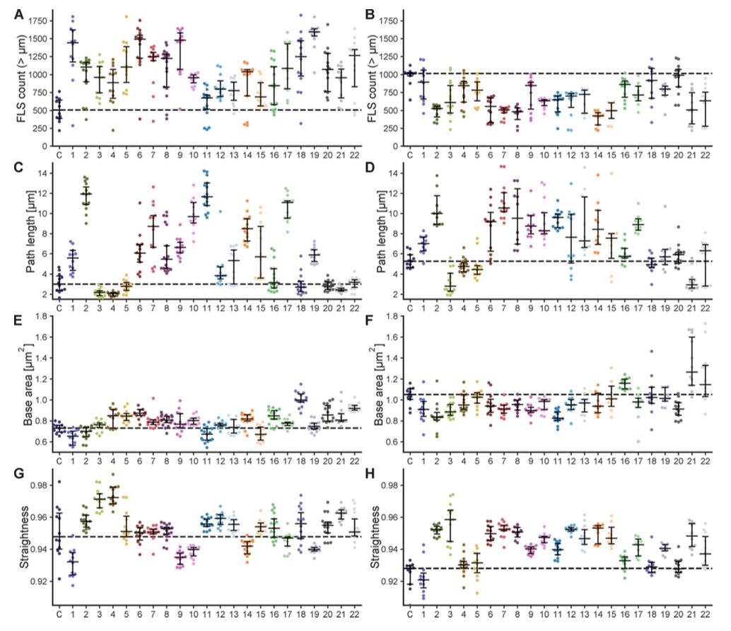 Figure S1. Quantification of FLS phenotypes on antibody addition. Swarmplots showing the output from FLSAce analysis for FLS assays where each different scFV is preincubated in the reaction mix, specifically illustrating the effects on number, base area (FLS thickness), length (path length) and straightness of each scFV. Colors match the colors of scFvs in Fig. 1. Data points represent mean values of FLS within an individual imaging region (n = 10–17 regions per condition). Black lines indicate the median with its 95% confidence interval. Data are from three independent experiments for each scFv containing no additional actin (A, C, E, and G) and two experiments where 1 μM of supplemental unlabeled actin was added (B, D, F, and H). The addition of unlabeled actin makes FLS longer, thus increasing the length over which morphologies, such as curliness, can be seen. Additional actin also means that the phenotype of antibodies that lead to longer FLS (perhaps by inhibiting depolymerization processes) is less limited by the concentration of actin and conversely, endogenous concentrations of actin (i.e., the no additional actin condition) can make phenotypes of shorter or fewer FLS more obvious. |