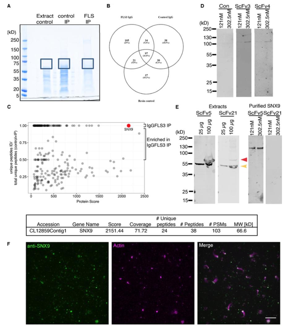 Figure S2. SNX9 is the antigen to scFvs 3, 4, 5, and 21. (A) Extracts, control, and IgGFLS3 immunoprecipitation. (B) Venn diagram of mass spectrometry identification from the gel sectors indicated in A. (C) SNX9 gives the highest protein score and number of unique peptides. (D) Western blot of purified SNAP- SNX9 (left lane = 121 nM, right = 302.5 nM) with scFvs 3 and 4. (E) Western blot of Xenopus egg extracts and purified SNX9 for scFv5 and 21, which detect a specific â¼70 kD band (red arrow), though scFv21 does not detect purified SNX9. (F) TIRF and confocal imaging of FLS immunolabeled using a rabbit anti-SNX9 polyclonal antibody illustrating SNX9 (green) localized at FLS tips as marked by actin (magenta; TIRF in isolated channel, maximal projection of a 1 μm z-stack in merged image). Scale bar, 10 μm. |