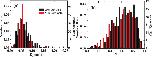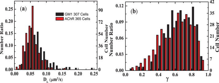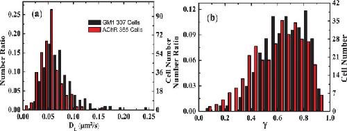 FIGURE 5:. (a) Comparison of the distribution of the measured long-time diffusion coefficients DL of GM1s (black bars) and AChRs (red bars) (b) Comparison of the distribution of measured mobile ratios γ of the GM1s (black bars) and AChRs (red bars). |
