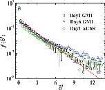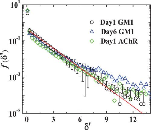 FIGURE 7:. Measured PDF f (δâ²) of the normalized diffusion coefficient δⲠ= δ/DL for the mobile GM1 trajectories. The data are obtained from two groups of 10 cells each cultured for 1 day (black circles) and 6 days (blue triangles), respectively. The green diamonds are obtained from the mobile AChR trajectories taken from a group of 10 cells cultured for 1day. The error bars indicate the SD of the black circles averaged over 10 cells. The red solid line is an exponential fit to the black circles, f (δâ²) â 0.45 exp (â0.82δâ²). |