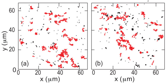 FIGURE 2:. (a) One hundred forty-three representative GM1 trajectories with 400 time steps (80 s). (b) One hundred sixty-two AChR trajectories with 400 time steps (80 s). All the trajectories are obtained from the bottom membrane of a Xenopus muscle cell with a viewing area 68 à 68 μm2. Red trajectories indicate fast-moving GM1s/AChRs and black ones indicate nearly immobile GM1s/AChRs. |