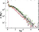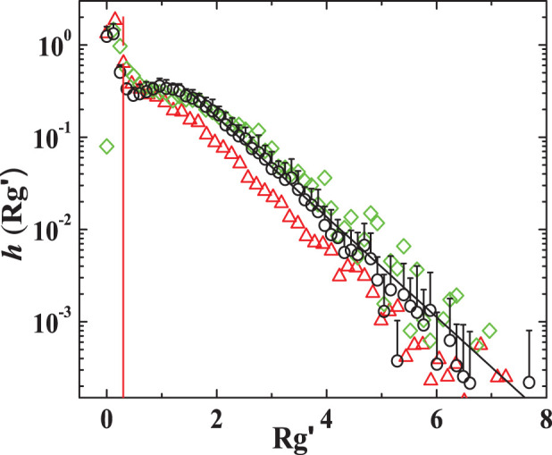 FIGURE 3:. Measured PDF (normalized histogram) h(Rgâ²) of the normalized radius of gyration Rgâ² for the GM1 trajectories taken at 5 fps (black circles) and 80 fps (green diamonds). The red triangles are obtained from the AChR trajectories taken at 5 fps. Each h(Rgâ²) is obtained by averaging the data from 70 cells under the same condition. The error bars indicate the SD of the measurements. The black solid line shows the exponential function h(Rgâ²) â 1.5 exp (â1.25 Rgâ²). The red vertical line indicates the cutoff value (Rgâ²)c = 0.3 used to define the immobile trajectories. |