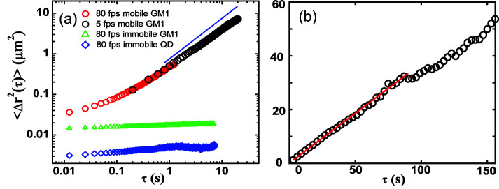 FIGURE 4:. (a) Measured MSD â©Îr2(Ï)⪠as a function of delay time Ï for the mobile GM1 trajectories taken at two sampling rates of 80 fps (red circles) and 5 fps (black circles). The green triangles are obtained from the immobile GM1 trajectories. Data from a single cell are used in the ensemble average. The blue diamonds are obtained from the immobile QDs, which are physically stuck on a coverslip. The blue solid line indicates the relationship â©Îr2(Ï)⪠with a slope of unity in the logâlog plot. (b) A linear plot of the measured â©Îr2(Ï)⪠as a function of Ï for the mobile GM1 trajectories taken from a single cell with a sampling rate of 0.25 fps. The red solid line is a linear fit to the data points with Ï < 45 s. |