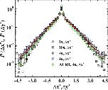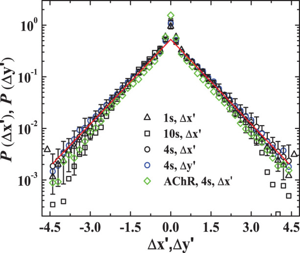 FIGURE 6:. Measured PDFs P (Δx′) and P (Δy′) of the normalized displacements Δx′ and Δy′ for the mobile trajectories of GM1s. The data are obtained from 10 cells under different sample conditions: 1) Δx′ (τ) with τ = 1 s (black triangles), 4 s (black circles), and 10 s (black squares); 2) Δy′ (τ) with τ = 4 s (blue circles); and 3) Δx′ (τ) with τ = 4 s for the mobile trajectories of AChRs from 10 cells (green diamonds). The error bars show the SD of the black circles averaged over 10 cells. The red solid line is an exponential fit to the black circles, P (Δx′) ≃ aexp (–β|Δx′|), with a = 0.53 and β =1.26. |