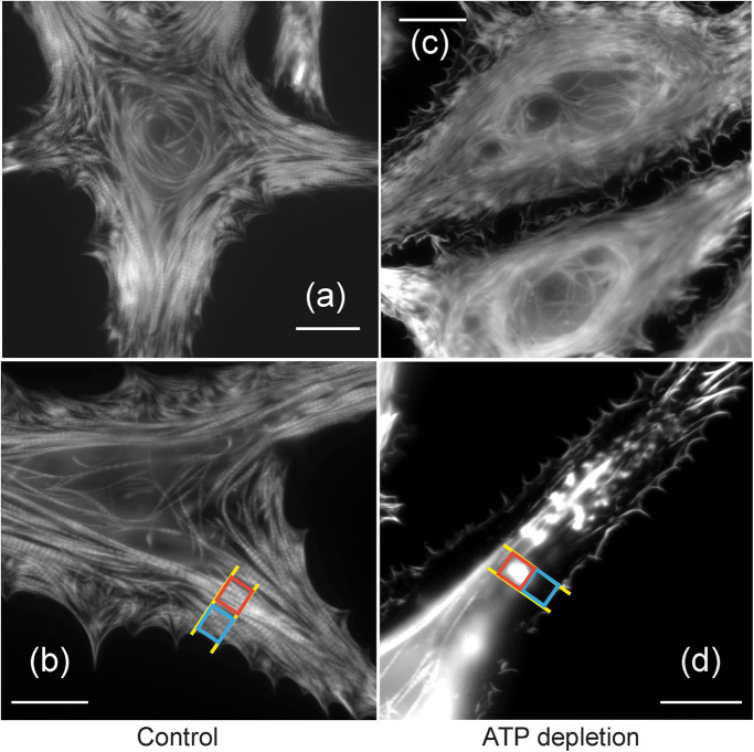 FIGURE 10:. Microscope images of the rhodamineâphalloidin stained F-actin filaments in a cultured Xenopus muscle cell. (a) Large view of an untreated (normal) cell; (b) enlarged view of a portion of the normal muscle cell; (c) large view of an entire cell (top portion of the image) after the ATP depletion; (d) enlarged view of a portion of the muscle cell after the ATP depletion, showing the local feature of F-actin filaments. All of the scale bars are 20 µm. The blue and red boxes in b and d show, respectively, a sampled cortical region and an adjacent bulk region further away from the cell boundary. Each box covers an area of 5 à 5 μm2, and they are aligned along the normal direction of the cell boundary, as indicated by the two parallel yellow lines. |