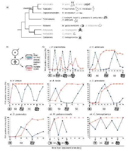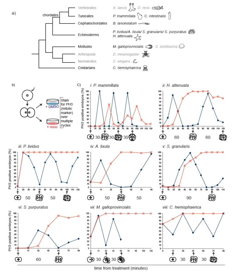 Figure 1. Nocodazole-induced spindle depolymerization defines two classes of embryos with qualitatively different mitotic responses. (a) Phylogenetic tree indicating phyla and species. Species analyzed in this study are in black, species for which information was obtained from the literature in grey. (b) Schematic representation of assay used to test mitotic progression. Two-cell stage embryos of selected species were treated either with DMSO or nocodazole and then fixed every 10â15 min for pH3 immunostaining. (c) Percentage of embryos accumulating pH3 in the presence of DMSO (blue) or nocodazole (red) over time (minutes indicated in x axis). Representative of 4 independent experiments, n = 50â200 embryos for each time point. Drugs were added when at least 90% of embryos were at 2-cell stage (t0). For M. galloprovincialis, control could not be quantified past 8 cells as divisions become asynchronous within each embryo. The duration of normal cell-cycle timing for each species is indicated under the corresponding graph. |