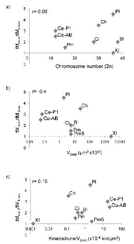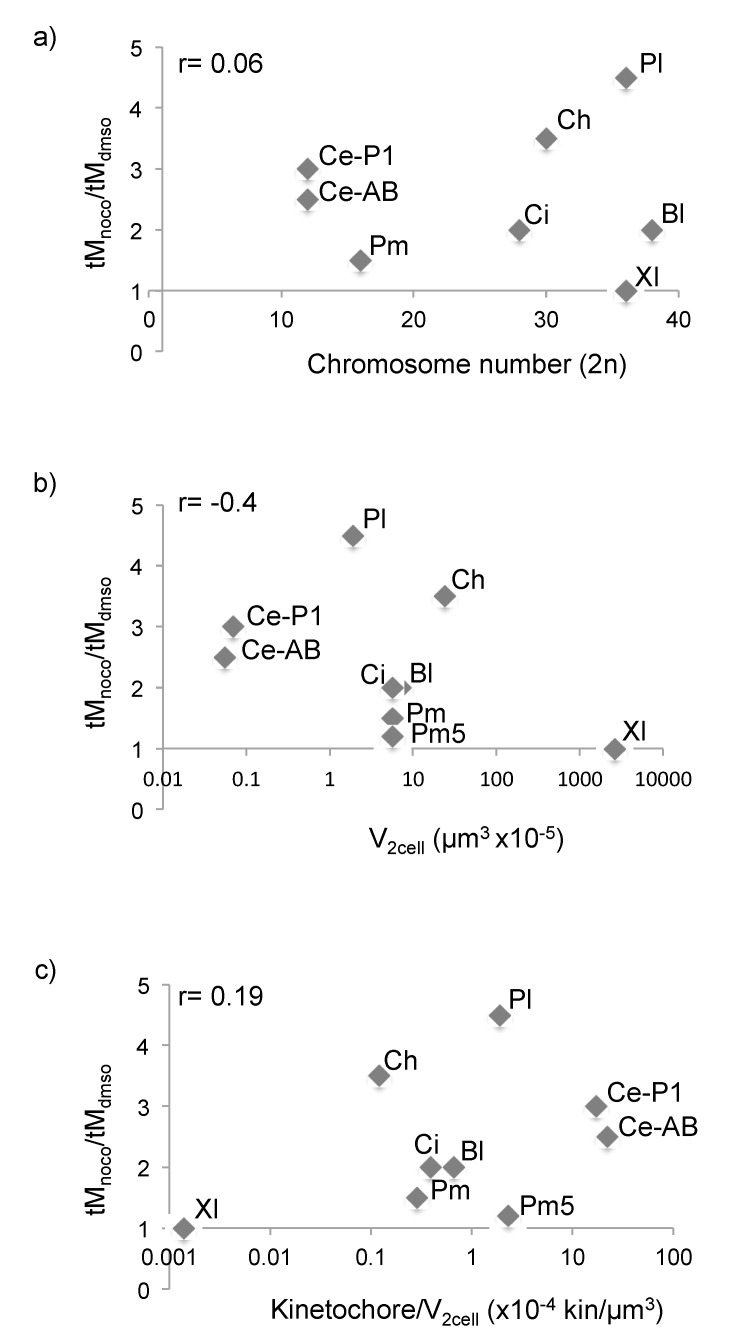 Figure 5. SAC response across species does not correlate with cell volume. (a–c) Ratio of average mitotic duration in nocodazole- and DMSO-treated embryos plotted against (a) chromosome number, (b) cell volume at 2-cell stage or (c) kinetochore/cell volume ratio at 2-cell stage. Bl = B. lanceolatum, Ci = C. intestinalis, Ce = C. elegans, Pl = P. lividus, Pm = P. mammillata, Pm5 = ratio after 4 cycles in nocodazole from Figure 3b, Ch = C. hemisphaerica and Xl = X. laevis. For Bl and Ci, mitotic duration was estimated from the time course graphs in Figure 4a,d, as width of the curve at 50% level. Ce and Xl data were obtained from the literature. For Ce, as the first division is asymmetric, both cells are presented (AB and P1). r indicates the coefficient of correlation for each set of variables. |