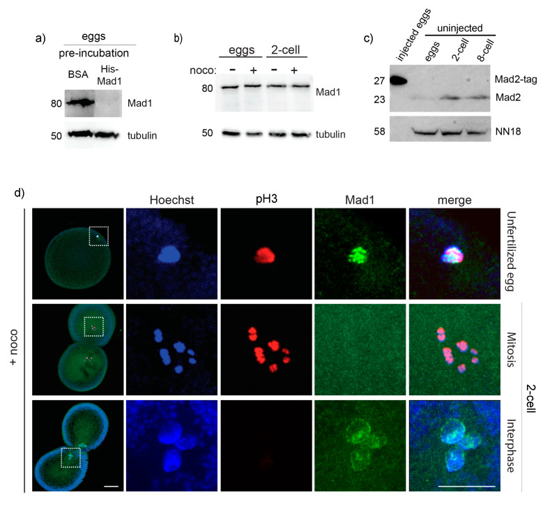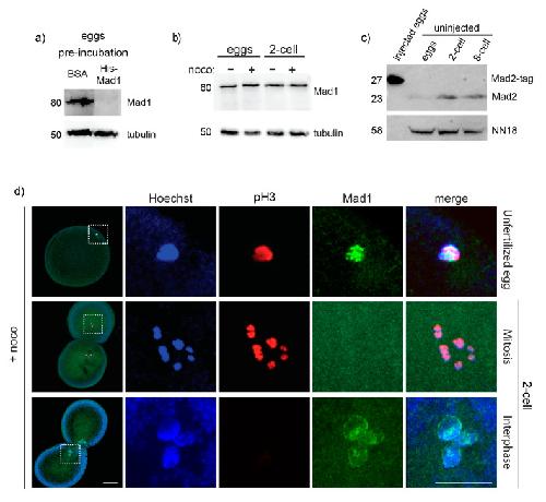Figure 6. Mad1 does not localize to unattached kinetochores in 2-cell P. mammillata embryos. (a) Mad1 antibody recognizes a single 80 KDa protein in P. mammillata egg extract which is specifically lost (top panel) in competition assays when incubated with purified His-Mad1, but not with the equivalent amount of BSA (15 µg), whereas tubulin levels (bottom panel) are unaffected. (b) Mad1 level is constant in both untreated and nocodazole-treated eggs and 2-cell embryos. (c) Mad2 antibody recognizes a single 23 KDa protein in P. mammillata eggs, 2-cell and 8-cell embryos, and a larger band of the correct size (27 KDa) when tagged Mad2 protein is overproduced by microinjection (left lane: 5 eggs injected with mRNA encoding Mad2 fused to 36 additional amino acids). (d) Representative images of nocodazole-treated eggs (top) and 2-cell embryos (middle and bottom panels) stained for Hoechst (blue), Mad1 (green), and pH3 (red). White squares in (d) indicate chromatin-containing regions enlarged (5Ã) on the right images. Scale bar = 30 µm. |