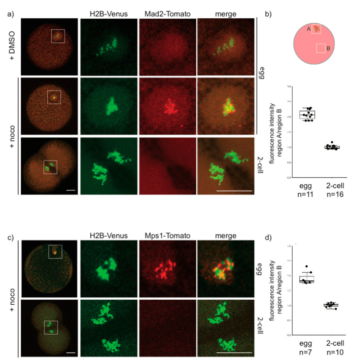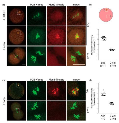 Figure 7. Mad2 and Mps1 are not recruited to unattached kinetochores in 2-cell P. mammillata embryos. (a) Representative images of live eggs (top, middle rows) and 2-cell embryos (bottom row) expressing histone H2B-Venus and Mad2-Tomato. (b) Ratio of Mad2-Tomato fluorescence intensity in chromosome region (A) and cytoplasm (B) in nocodazole-treated eggs and 2-cell embryos (c) Representative images of live eggs (top) and 2-cell embryos (bottom) expressing histone H2-Venus and Mps1-Tomato. (d) Ratio of Mps1-Tomato fluorescence intensity in chromosome region (A) and cytoplasm (B) in nocodazole-treated eggs and 2-cell embryos. White squares in (a,c) indicate chromatin-containing regions enlarged (5Ã) on the right images. Scale bar = 30 µm. |