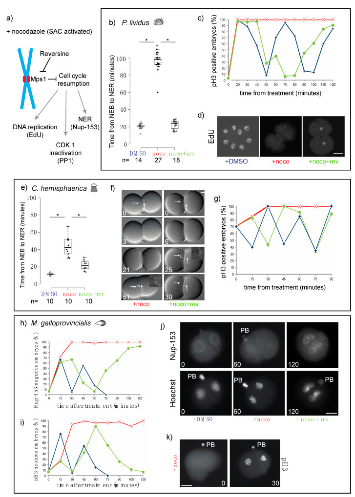 Figure 2. Microtubule depolymerization causes an Mps1-mediated mitotic block in cleavage stage embryos of P. lividus, C. hemisphaerica, and M. galloprovincialis. (a) Schematic representation of the effect of reversine on cell cycle progression during spindle assembly checkpoint (SAC) activation (+ nocodazole). (b) Quantification of duration of mitosis in P. lividus embryos treated with DMSO, nocodazole, or nocodazole and reversine. Mitosis was measured as time from nuclear envelope breakdown (NEB) to nuclear envelope reformation (NER). Boxes represent 25thâ75th percentiles and the median is shown; whiskers mark 5th and 95th percentiles. Each dot represents one cell. Asterisks indicate statistical significance as determined by Studentâs t-test, p < 0.001. (c) Quantification of embryos accumulating pH3 in the presence of DMSO (blue), nocodazole (red) or nocodazole/reversine (green) over time equivalent of two cell cycles. (d) Labeling of newly replicated DNA by 5-ethynyl-2â²-deoxyuridine (EdU) incorporation in embryos treated with DMSO (left), nocodazole (middle), or nocodazole/reversine (right). (e) Quantification of duration of mitosis in C. hemisphaerica embryos treated with DMSO, nocodazole, or nocodazole/reversine. Box plot parameters as in (b). (f) Representative DIC images of embryos treated with nocodazole (left) or nocodazole/reversine (right). Arrows point at nuclei visible in DIC optics. White squares indicate nuclei-containing regions at time of NER, enlarged in insets. (g) Quantification of pH3 positive C. hemisphaerica embryos in the presence of DMSO (blue), nocodazole (red), or nocodazole/reversine (green). Representative of 4 independent experiments, n = 20â30 for each time point. (h) Quantification of Nup153-labeled and (i) pH3-labeled M. galloprovincialis embryos after treatment with DMSO (blue), nocodazole (red), or nocodazole/reversine (green). (j) Representative images of embryos stained for Nup153 (top), DNA (Hoechst, bottom), and (k) pH3. PB = polar body. Scale bar = 30 µm. |