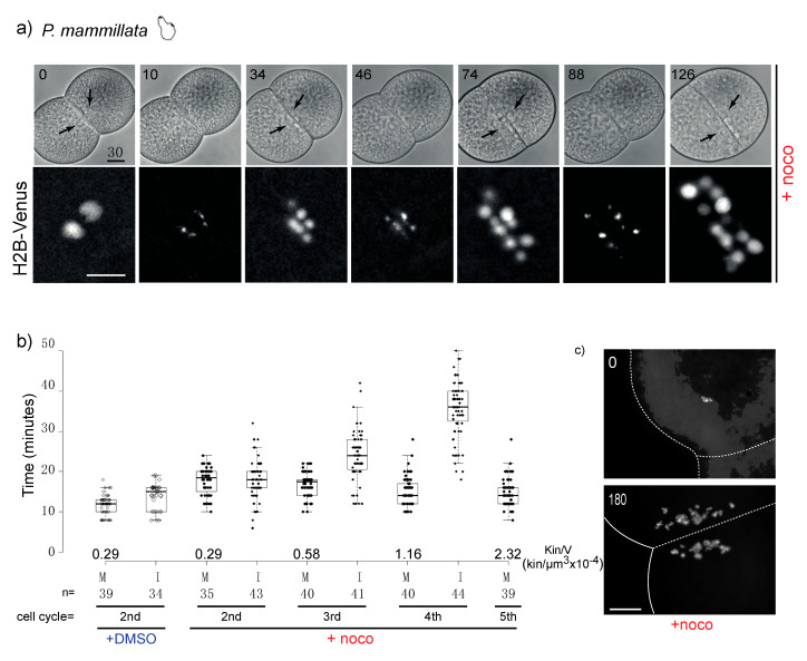 Figure 3. P. mammillata 2-cell embryos do not arrest in mitosis in the absence of spindle microtubules. (a) Selected frames from a time-lapse movie of a P. mammillata embryo expressing the DNA reporter, H2B-Venus, treated with 10 µM nocodazole after first cleavage. Numbers indicate minutes after treatment. Arrows indicate nuclei visible in bright field optics. See movie 1. (b) Duration of mitosis (M, NEB to NER) and interphase (I, NER to NEB) in P. mammillata embryos treated with DMSO or nocodazole. Kin/V indicates kinetochore to cell volume ratio at each cell cycle starting from fertilization (1st is 1-cell mitosis; 2nd is 2-cell mitosis). Box plot parameters as in Figure 2b. In nocodazole-treated embryos the amount of DNA increases due to subsequent rounds of DNA replication without intervening cytokinesis. Duration of mitosis in control DMSO-treated embryos is constant in all four analyzed cell cycles. (c) DAPI (4â²,6-diamidine-2â²-phenylindole dihydrochloride)-stained chromosome spreads from DMSO and nocodazole-treated (180 min) P. mammillata embryos. After 180 min nocodazole treatment, embryos have undergone 4 more cell cycles and have 4 times more DNA than at time 0. In the absence of microtubules, the nuclei which form around chromosome clusters (karyomeres) do not fuse and are dispersed over time by cytoplasmic flow (in (a,c)). Scale bar = 30 µm. |