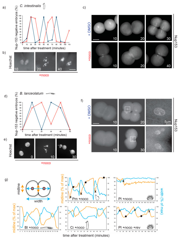 Figure 4. Nocodazole treatment does not delay mitotic progression during cleavage in chordate embryos. (a) Quantification of Nup153-negative C. intestinalis embryos (without nuclei = mitosis) in the presence of DMSO (blue) or nocodazole (red) over the time of 3 divisions (2â16 cells). Representative of 3 independent experiments. n = 20â30 embryos for each time point. (b) Representative C. intestinalis Hoechst-stained nuclei and (c) Nup-153-stained embryos. (d) Percentage of B. lanceolatum embryos without nuclei, as determined by Nup-153 staining, in the presence of DMSO (blue) or nocodazole (red) over the time of two divisions (2â8 cells). Representative of 3 independent experiments. n = 50â100 embryos per time point. (e) Representative B. lanceolatum Hoechst-stained nuclei and (f) Nup-153-stained embryos. Numbers indicate minutes after treatment. (g) Measurement of long axis of embryo (width, blue) and cellâcell contact region (midline, orange) during 2â3 cell cycles in a representative embryo of B. lanceolatum (Bl), P. mammillata (Pm, see movie 1), C. intestinalis (Ci), and P. lividus (Pl) in the presence of nocodazole (+ noco; movie 2) or for Pl nocodazole/reversine (Pl + noco + rev; movie 3). Measurements are reported as percentage of maximum length throughout the recording. Crosses (Ã) correspond to NEB, and circles (â¢) to NER. Scale bar = 30 µm, unless otherwise indicated. |