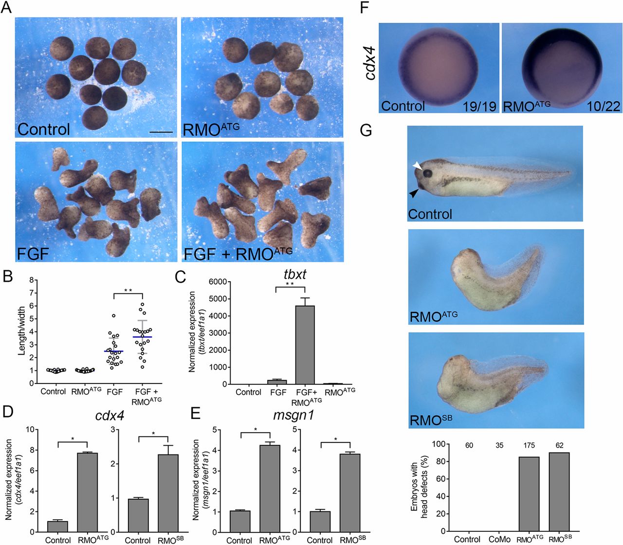 Fig. 2. Rspo2 depletion promotes FGF signaling. (A,B) Two-cell embryos were injected animally with RspoMOATG (10â ng) or RspoMOSB (20â ng). Ectoderm explants were dissected at stage 8, treated with 25â ng/ml of FGF2 and cultured until stage 13. (A) Representative morphology of the embryos. (B) Quantification of the data in A, representative of two independent experiments. (C) RT-qPCR shows enhanced tbxt expression in FGF-stimulated ectodermal explants (stage 13) after Rspo2 depletion. (D,E) Enhanced cdx4 and msgn1 expression in the dorsal marginal zone (DMZ) explants depleted of Rspo2. RT-qPCR was carried out in stage 13 DMZ explants that were isolated at stage 10. Data are means±s.d. for triplicate samples. Graphs are representative of three independent experiments. (F) In situ hybridization with antisense cdx4 probes was carried out with stage â¥10 control embryos and embryos injected marginally four times with 10â ng of RspoMOATG. The number of embryos with the displayed phenotype and the total number of injected embryos are shown. (G) Two dorsal animal blastomeres of four-cell embryos were injected with RMOATG or RMOSB (10-20â ng each). Representative embryos are shown at stage 39. Arrowheads point to the eye (white) and the cement gland (black). The graph presents frequencies of embryos with head defects (missing eyes, cement gland and reduced facial structures). Numbers of embryos per group are shown at the top of each bar. Data are representative of three to four independent experiments. **PPt-test. Scale bar: 300â µm.