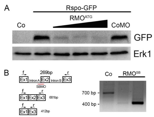 Fig. S2. Validation of Rspo2 knockdown in vivo. A, Embryos were injected with Rspo2-GFP RNA (500 pg) alone or coinjected with increasing amounts of RspoMOATG (10, 20, and 30 ng). Lysates were prepared from injected embryos at stage 11 for immunoblotting with anti- GFP antibody. CoMO (control MO). Co, control uninjected embryo. Erk1 is a control for loading. B, Schematic of RT-PCR to detect changes in Rspo2 RNA splicing. The PCR fragment of 681 bp corresponds to three exons expected in a control embryo. The 412 bp DNA fragment is expected for Rspo2.L RNA with un-spliced exon 2. RT-PCR was carried out with RNA prepared from stage 11 embryos previously injected with RspoMOSB (20 ng). PCR fragments corresponding to a control embryo (Co) and two different embryos injected with RspoMOSB are shown.