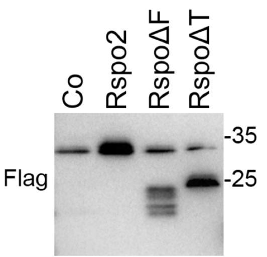 Fig. S3. Expression levels of Rspo2 constructs. RNAs encoding different Flag-tagged Rspo2 constructs (see Fig. 3A) were injected into four cell embryos, ectoderm explants were isolated at midblastula stages and cultured until stage 11 for immunoblotting with anti- Flag antibody.
