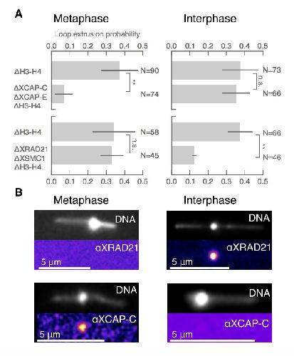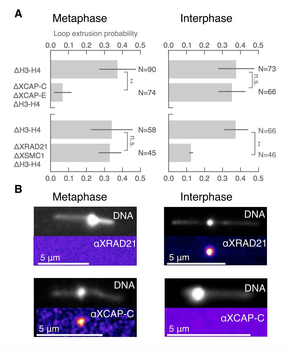 Figure 3: Condensin extrudes DNA loops in metaphase and cohesin extrudes loops in interphase. (A) Loop extrusion probabilityâthe frequency at which looping occurs on a strand with sufficient slackâin metaphase and interphase under different depletion conditions. In metaphase, co-depleting condensin I, condensin II, and H3-H4 (using anti- XCAP-C/E and anti-H4K12Ac) significantly (** represents p<0.01, Binomial test) reduced loop extrusion probability, whereas the same depletion condition in interphase had no effect on loop extrusion probability compared to H3-H4-depleted extract. However, depleting cohesin and H3-H4 (using anti-XRAD21/XSMC1 and anti-H4K12Ac) had no effect in metaphase, though significantly (p<0.01) decreased loop extrusion probability in interphase compared to H3-H4-depleted extract. (B) Snapshots of antibody stainings of representative loops in metaphase and interphase. (Top) In metaphase, Alexa488-labeled anti-XRad21 bound to cohesin does not localize to the loop, whereas in interphase (right panels), the anti- XRad21 co-localizes to the loop. (Bottom) Alexa488-labeled anti-XCAP-C bound to condensin localizes to the loop in metaphase, but does not localize to the loop in interphase. |