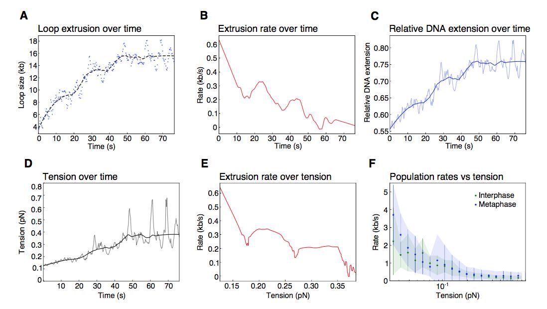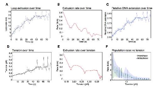 Supplementary Figure 3: Biophysical characterization of loop extrusion rate and DNA tension. (A) Example of one metaphase loop extrusion event (blue dots) smoothed by a Savitzky-Golay filtering with a 2nd-order polynomial and a window size of 63 points (black dashes). (B) The extrusion rate of the looping event was obtained from the first- order derivative of the smoothed curve. (C) Relative DNA extension was calculated as the end-to-end distance divided by the amount of DNA outside of the loop region using the raw loop data (blue shaded curve) and the smoothed loop data from (A). (D) Tension on the DNA strand resulting from the reeling of DNA into the loop was obtained from applying the worm like chain model41 for DNA to the relative extension values in (C) with the raw data as the shaded curve. (E) Rate of loop extrusion plotted over the tension on the DNA strand for the single looping event in (A). (F) Loop extrusion rates over DNA tension for the population of metaphase (blue dots and envelope) and interphase looping events (green dots and envelope) from exponential fit curves to the loop data. Dots represent mean values, error bars and envelope represent standard deviation. |