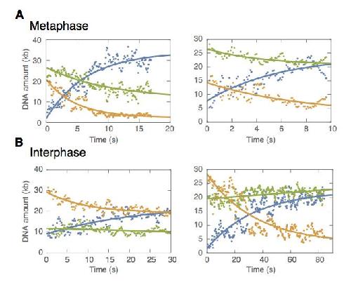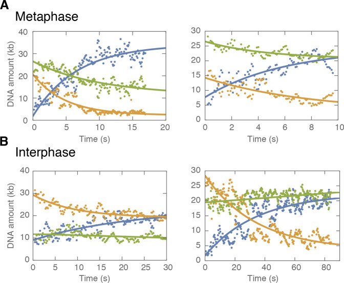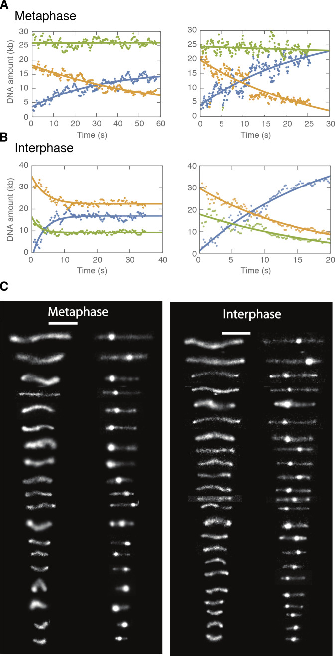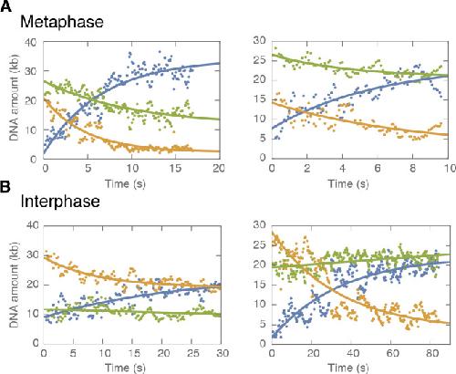 Figure 2âfigure supplement 3. Examples of symmetric DNA loop extrusion in metaphase and non-symmetric loop extrusion in interphase.We quantified the amount of DNA inside the loop (blue dots) and the regions left and right of the loop (region I in orange and region II in green) from the relative integrated DNA fluorescence intensities in each region for each time point. The lines represent exponential fits to the data. (A) Examples of metaphase looping events exhibiting two-sided (symmetric) DNA loop extrusion where DNA is reeled in from both regions outside of the loop. (B) Examples of one-sided (non-symmetric) DNA loop extrusion events in interphase, showing one-sided reeling of DNA into the loop from only one region outside of the loop. |