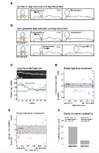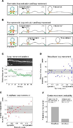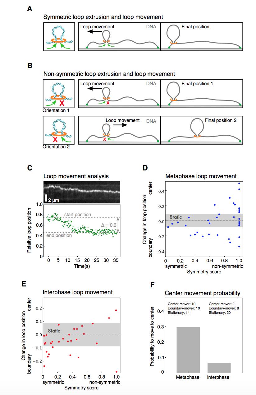 Supplementary Figure 5: Characterization of loop movement and symmetry. (A) Schematics of symmetric loop extrusion. Reeling in DNA from both sides at similar rates displaces the loop towards the shorter end of the DNA, as the smaller amount of slack in the shorter region is used up faster. (B) The displacement of a loop along the DNA strand by non-symmetric extrusion depends on the direction of extrusion. If the orientation of the extrusion machinery is random, it has equal chances to be directed towards the center of the DNA or the closest boundary. (C) We followed the movement of the DNA loop by tracking the relative location of the maximum of signal intensity for each time point. Top: kymograph of a metaphase looping event. Bottom: corresponding relative position of the loop for each time point. We then quantified the relative change in loop position along the DNA strand with respect to the centre of the DNA strand and the nearest boundary. This allowed us to plot the relative change in loop position over the corresponding symmetry score for all looping events in (D) metaphase and (E) interphase. We classified each looping event by its displacement towards the center, the nearest boundary, or as static, if the displacement did not exceed a threshold of 0.08 (see Methods). (F) Based on the displacement of all looping events, we could compare the probability for a loop to move to the centre of the DNA strand in metaphase and interphase. |