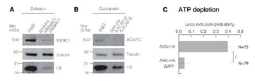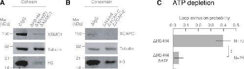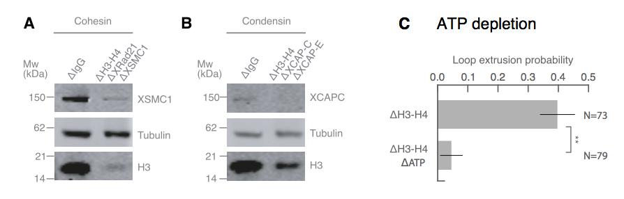 Supplementary Figure 8: Co-immunodepletions of Xenopus egg extracts using antibodies targeting H3-H4, cohesin, and condensin I and II. (A) Co- immunodepletion of H3-H4 using anti-H4K12Ac antibodies and cohesin using anti-XRAD21 and anti-XSMC1 antibodies. H3 protein levels are detected using anti-H3 and exhibits a ~90- 95% depletion of soluble H3-H4 heterodimers compared to IgG-depleted extract. XSMC1 protein levels are detected using anti-XSMC1, which exhibits a ~90% depletion. We used anti-DM1a that detects tubulin as a loading control. (B) Co-immunodepletion of H3-H4 using anti-H4K12Ac antibodies and condensin using anti-XCAP-C and anti-XCAP-E antibodies. H3 protein levels are detected using anti-H3 and exhibits a ~90% depletion of soluble H3-H4 heterodimers compared to IgG-depleted extract. XCAP-C protein levels are detected using anti-XCAP-C, which displays a ~85% reduction, although the signal is rather weak and made it challenging to quantify. We used anti-DM1a that detects tubulin as a loading control. (C) Enzymatic depletion of ATP by apyrase (left) in H3H4-depleted interphase extract greatly reduces loop formation probability compared to control H3H4 depleted interphase extract (right). |