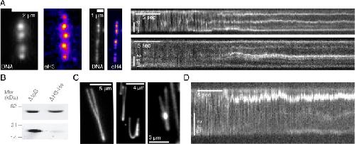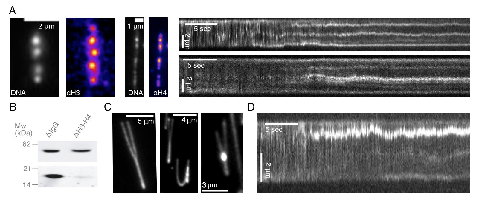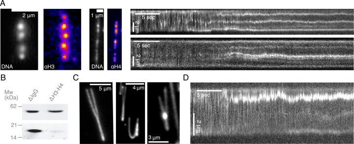 Figure 1—figure supplement 1. Characterization of DNA compaction in Xenopus laevis egg extracts.(A) Addition of crude extract to λ-phage DNA molecules leads to the generation of multiple highly-enriched DNA clusters, suggestive of nucleosomal formation along the strand. Alexa488-labeled anti-H3 and anti-H4k12ac localize to these DNA clusters (left). Kymographs of nucleosomal cluster formation in both metaphase (upper) and interphase (lower) along a strand upon addition of crude extract. See also Figure 1—videos 1–2. (B) Quantitative western blot showing approximately 90–95% depletion of soluble H3-H4 heterodimers. (C) Examples of completely stretched loops in metaphase (left and middle) and a partially extended interphase loop (right) upon hydrodynamic stretching with buffer flow perpendicular to strand orientation. (D) Kymograph of a looping event on a strand upon treatment with crude extract. See also Figure 1—video 10. |