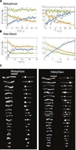 Supplementary Figure 2: DNA looping examples demonstrating non- symmetric loop extrusion in metaphase and symmetric loop extrusion in interphase. We tracked the position of the loop and segmented the DNA signal into a loop region (blue) and region I and II (orange and green). The integrated fluorescence intensity in each region was converted into the relative amount of DNA in that region as described above and plotted as a function of time. The dots are data from the analysis and the lines represent single exponential fits to the data. (A) In metaphase, we observed a saturating exponential increase in the DNA amount in the looped region, and only a single non-looped region decreasing in DNA amount, suggestive of non-symmetric loop extrusion. (B) In interphase, we observed a similar saturating exponential increase in the DNA amount in the looped region, whereas both non-loop regions decreased in DNA amount, suggestive of symmetric loop extrusion. (C) Representative snapshots of DNA looping in H3-H4-depleted interphase and metaphase extracts ordered by end-to-end distance. Left image represents the initial DNA configuration and right image the corresponding final loop configuration. Scale bar is 5 micro-m. |