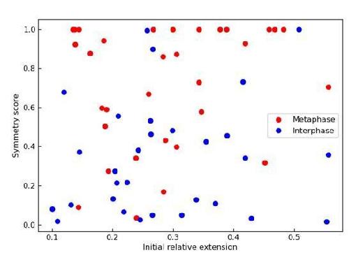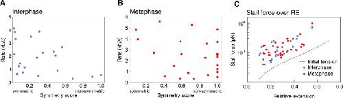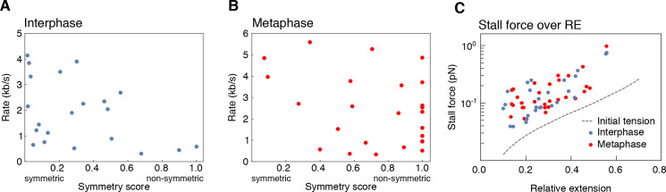 Supplementary Figure 6: Dependency of loop extrusion rate on extrusion symmetry and stall forces on initial relative DNA extension. We quantified the loop extrusion rate as a function of extrusion symmetry (symmetry score) in both (A) interphase and (B) metaphase (C) for the events corresponding to Figure 2C. Using the worm-like chain model41, we computed the stall forces for both interphase and metaphase looping events from the plateau size of the loop and plot these values as a function of initial relative extension of the DNA strand before the loop formed. The hatched line shows the initial tension on the DNA strand before the onset of loo formation as a function of end-to-end distance of the DNA molecules. The resulting stall forces are conserved between inter- and metaphase and show a slight dependency on the initial relative extension of the DNA strand, possibly by selecting for stronger loops in stretched-out DNA molecules. |