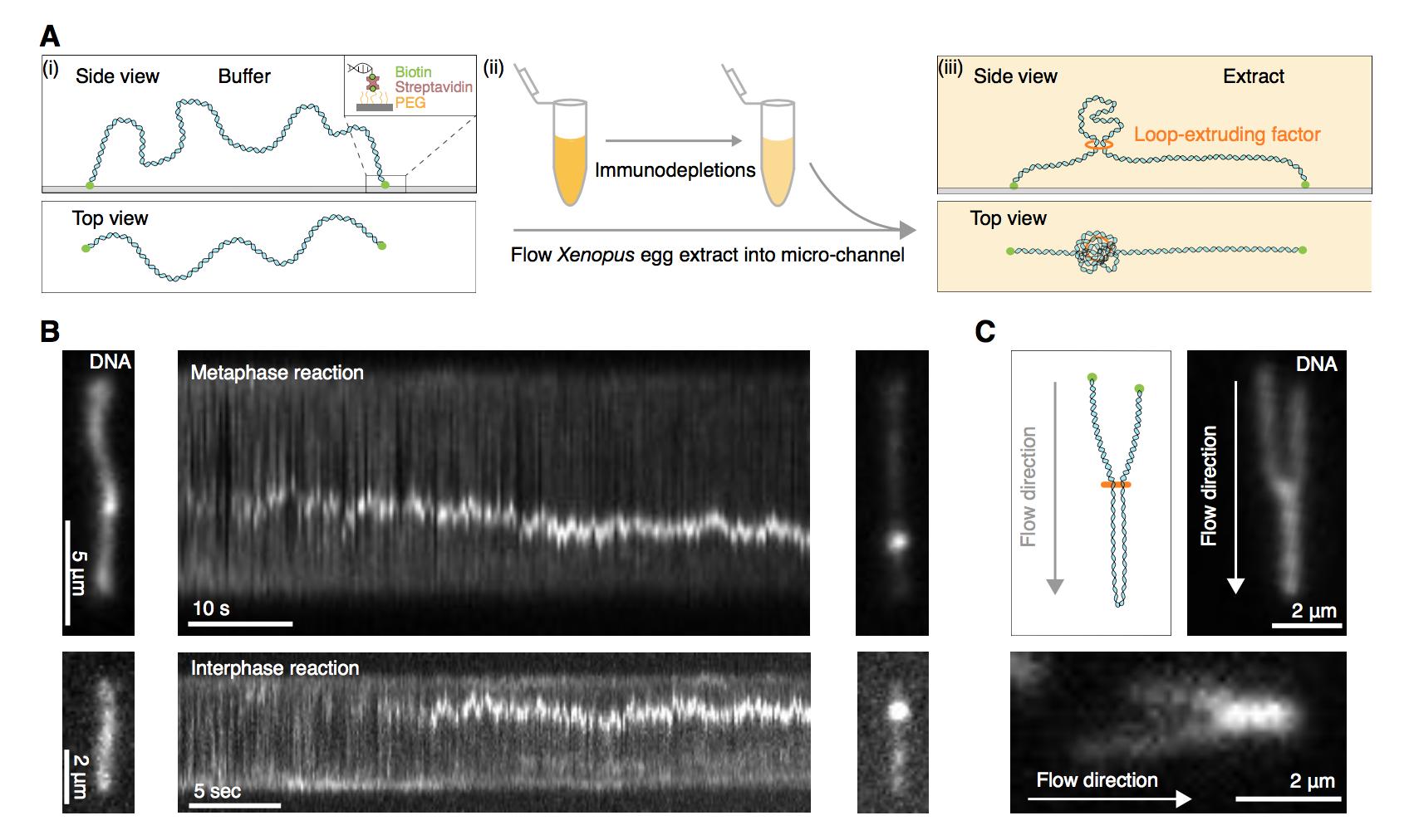 Figure 1: Single DNA molecule assay for direct visualization of DNA looping in Xenopus egg extracts. (A) (i) Side and top view schematics of a single strand of λ-phage DNA attached to a functionalized cover slip via biotin-streptavidin linkers. (ii) Xenopus egg extract is flowed into the microfluidic chamber. (iii) Side and top view schematics visualizing how soluble active loop-extruding factors extrude loops in H3-H4-depleted extract. (B) Dynamics of the formation of DNA loops induced by H3-H4-depleted extract in metaphase (upper) and interphase (lower). Snapshot of a single molecule of λ-phage DNA visualized using Sytox Orange preceding treatment with H3-H4-depleted extract (left). Kymograph of DNA signal over time displaying a looping event upon addition of H3-H4-depleted extract (middle). Snapshot of steady-state DNA looping event after ~60 sec (right). (C) Hydrodynamic flows reveal loop topology within DNA cluster. (i) Schematic of the loop topology revealed upon flow. (ii) Topology of extract-induced DNA loops in metaphase (upper) and interphase (lower) visualized using Sytox Orange revealed upon flow in the direction of the arrow. |
