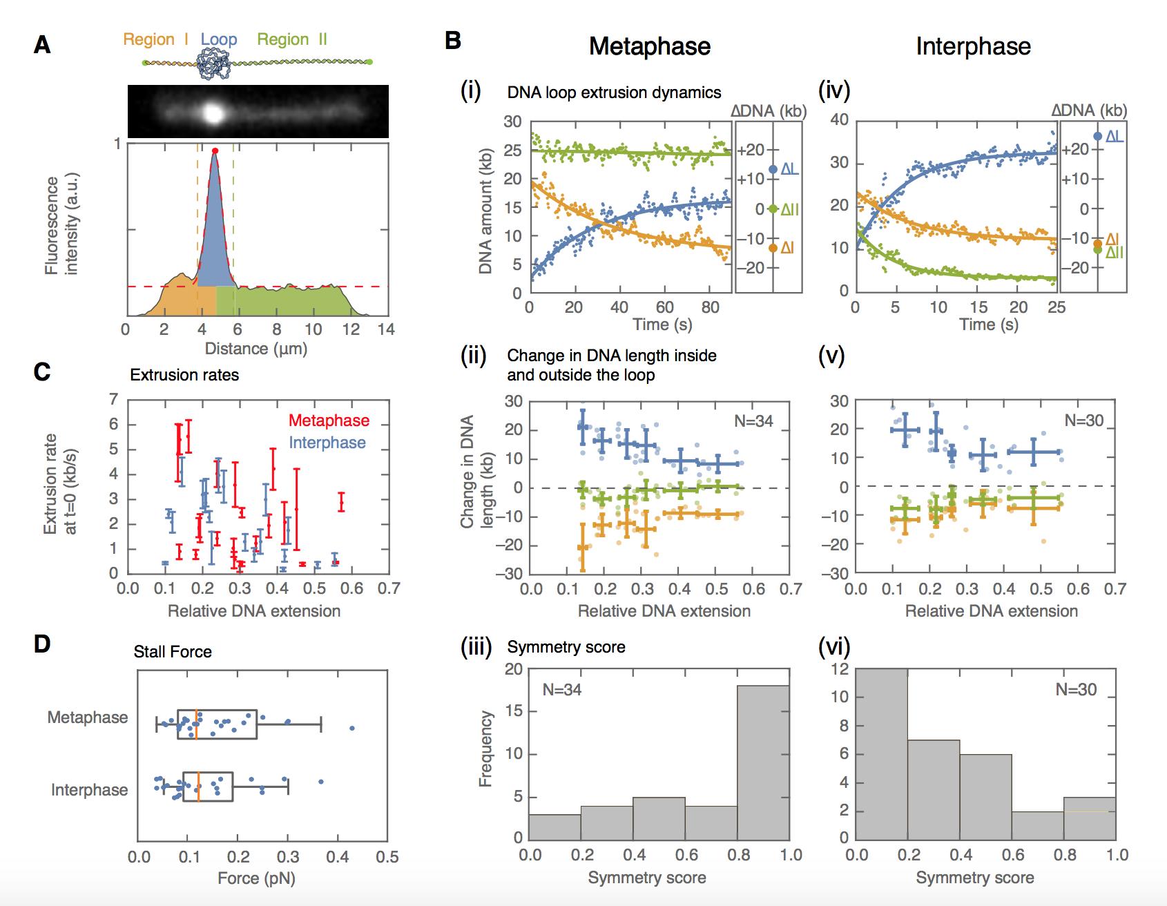 Figure 2: Symmetry of loop extrusion is cell-cycle dependent with similar extrusion rates and stalling forces. (A) Method to track DNA-loop dynamics through space and time. Upper: Schematic of the top view of a DNA-looping event segmented into three regions: region I (orange), region II (green), and the loop region (blue). Middle: Snapshot of DNA- looping event where DNA is labelled using Sytox Orange. Bottom: The integrated fluorescence intensity of the DNA generated by summing the intensity values along the perpendicular axis of the strand. The dashed red line represents a Gaussian fit to the data. Signal values above the fitâs offset define the looped region given in blue; signal values below this threshold correspond to the non-looped regions I and II, given in orange and in green. To convert the signal into DNA length, the integrated intensity of each region is divided by the total summed intensity of the DNA strand and multiplied by the total length of λ-phage DNA (48.5 kb). (B) Dynamics of DNA looping in H3-H4-depleted extract in metaphase and interphase. (Bi,iv left) DNA amount as a function of time computed for the looped region (blue) and non-looped regions I and II (green and orange). The dots represent experimental data and the solid lines represent exponential fits to the data. (Bi,iv right) The redistribution of DNA during the looping events shown in the left panel quantified as the change in DNA content in each region. (Bii, v) Change in the amount of DNA in the looped region and non-loop regions I and II (as in Bi,iv right) for the entire population of meta- and interphase looping events plotted as a function of the initial relative DNA extension of the corresponding molecules. Error bars correspond to standard deviations of data clustered by proximity. Points represent raw data. (Biii, vi) Analysis of loop extrusion symmetry shows predominantly non-symmetric extrusion (symmetry score ~ 1) in metaphase (Biii) and symmetric extrusion (symmetry score ~ 0) in interphase (Bvi). (C) Initial growth rates of DNA loop extrusion in metaphase (red) and interphase (blue) as a function of initial relative DNA extension. These rates were obtained from the slopes of the exponential fits to the loop data at time t=0 for the subset of loop extrusion events that allowed for a fitting that converged within a tolerance (10^(-8) relative change of the cost function), that corresponded to N=21 out of 30 in interphase, and N=24 out of 34 for metaphase. Error bars were obtained from error propagation of the uncertainties of the exponential fit parameters. (D) Box plots of the stall forces for DNA loop extrusion in metaphase and interphase obtained from the final relative extension of the DNA strand at the end of loop formation. |