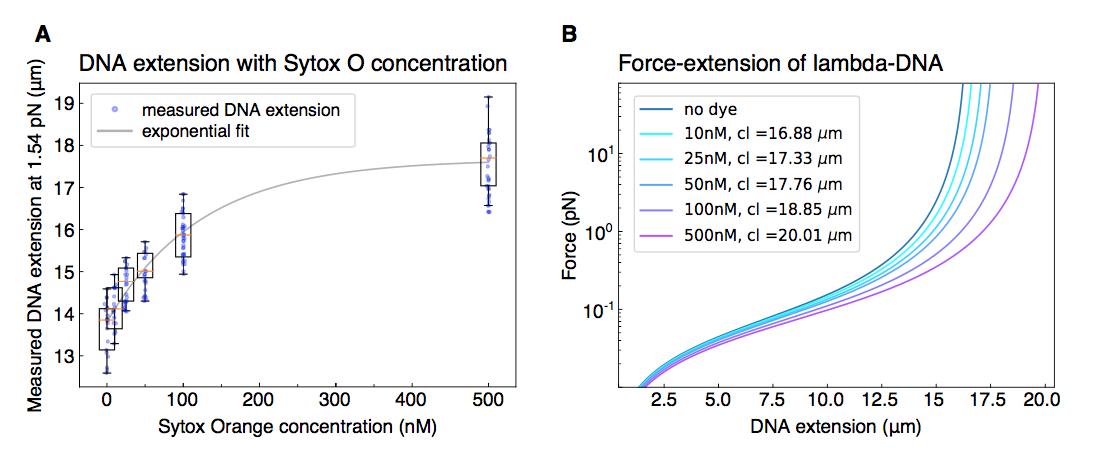 Supplementary Figure 7: Dye-induced DNA lengthening. (A) To correct for the concentration-dependent lengthening of DNA by intercalating dye Sytox Orange, we measured the extension (in ïm) of DNA molecules that we hydrodynamically stretched using a buffer flow-rate corresponding to 1.54 pN, for all Sytox Orange concentrations employed in the study. The exponential fit to the data serves as a guide to the eye. (B) The corresponding contour lengths (cl) were determined for each dye concentration by applying the worm like chain model41 to the average measured DNA extension at the known stretching force of 1.54 pN. |