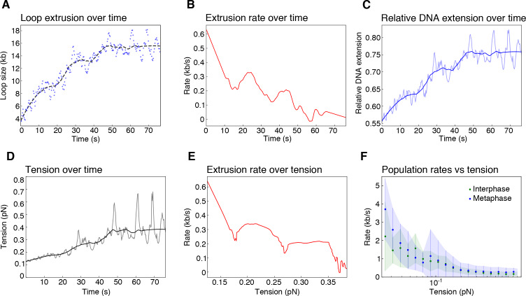 Figure 2—figure supplement 2. Biophysical characterization of loop extrusion rate and DNA tension.(A) Example of one metaphase loop extrusion event (blue dots) smoothed by a Savitzky-Golay filtering with a 2nd-order polynomial and a window size of 63 points (black dashes). (B) The extrusion rate of the looping event was obtained from the first-order derivative of the smoothed curve. (C) Relative DNA extension was calculated as the end-to-end distance divided by the amount of DNA outside of the loop region using the raw loop data (blue shaded curve) and the smoothed loop data from (A). (D) Tension on the DNA strand, resulting from the reeling of DNA into the loop, was obtained from applying the worm like chain model (Marko and Siggia, 1995) for DNA to the relative extension values in (C) with the raw data as the shaded curve. (E) Rate of loop extrusion plotted over the tension on the DNA strand for the single looping event in (A). (F) Loop extrusion rates over DNA tension for the population of metaphase (blue dots and envelope) and interphase looping events (green dots and envelope) from exponential fit curves to the loop data. Dots represent mean values, error bars and envelope represent standard deviation. |