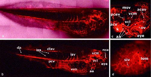 Fig. 4. Vasculature of stage 40â41 embryos. Confocal images (z-width 43.4 m) of (a) DIC and fluorescence and (b) fluorescence only of a stage 40 embryo showing the vena capitis lateralis (vcl) and the vena capitis medialis (vcm) and the further sprouting of the intersomitic vessels (isa, isv). (c) Confocal image (z-width 38.4 m) of a dorsolateral view of the head of stage 41 embryo showing the anterior cerebral vein crossing the head (acev) and the many small capillaries that cross the head between the cerebral veins, as well as the dominance of the vcl over the vcm. (d) Ventral view of a stage 41 embryo gut showing the subintestinal vein (siv) draining into the left omphalomesenteric vein (lom), taken with wide-field microscopy. |