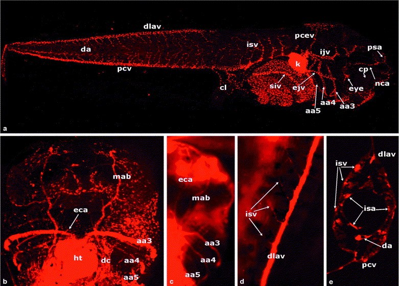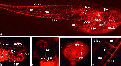 Fig. 6. Vasculature of stage 46 embryo. (a) Confocal image (z-width 1.0 m) of a lateral view of a stage 46 embryo showing the nasociliary artery and the expanding capillary networks of the dorsal head and between the intersomitic vessels (isv). (b, c) Ventral views of stage 46 embryos showing the extensive vascular supply to the filter apparatus, particularly the ventralmost venous drainage into the musculoabdominal veins (mab). The musculoabdominal veins drain into the Duct of Cuvier (dc) lateral to the heart. The persisting aortic arches (3â5) can also be seen (aa3â 5) and supply the external carotid artery (eca) and the pulmonary artery. (b) A confocal image (z-width 66.9 m) and (c) was taken with wide-field microscopy. (d) Dorsal view of the tail of a stage 46 embryo showing the dorsal longitudinal anastomosing vessel (dlav) with paired intersomitic vessels sprouting off of the dlav at regular intervals (wide-field microscopy). (e) A 10- m frozen section of a stage 46 tail showing the existence of a pair of intersomitic arteries (isa) and veins (isv) at the same intersomitic junction and the arrangement of the isa medial to the isv (taken with wide-field microscopy). |