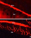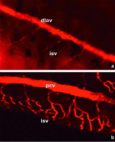 Fig. 12. Stereotypical development of the vascular system. (a) Dorsal view of the dorsal longitudinal anastomosing vessel (dlav) showing the regular pattern of paired intersomitic vessels at each somitic junction. (b) Ventral view of the posterior cardinal vein (pcv) showing the repeated pattern of intersomtic veins branching into a triple capillary system. (a) A 10 magnification taken with a Zeiss Axioplan. (b) A projection of a z-stack (z-width 27.9 m) taken with a confocal microscope. |