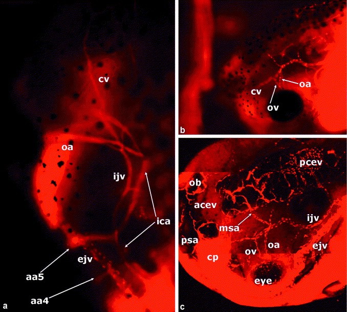 Fig. 7. Vasculature of the dorsal head of stage 46 embryos. (a) Dorsal view showing the proximal relationship of the internal carotid artery (ica) and the internal jugular vein (ijv). In addition, the ventral external jugular vein (ejv) can be seen crossing dorsolaterally to drain into the Duct of Cuvier and pronephric sinus (k). (b) Dorsolateral view of the head of a stage 46 embryo. (a) and (b) were obtained using a Zeiss Axioplan. (c) A dorsolateral view obtained using confocal microscopy (z-width 30.0 m). |