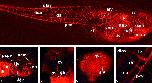 Fig. 2. Vasculature of stage 33/34 embryos at the initiation of the heart beat. Confocal images of (a) DIC and fluorescence and (b) fluorescence alone showing the heart (ht), first aortic arches (aa-3), eye, anterior (acv), and posterior (pcv) cardinal veins which drain into the pronephric sinus (k) and Duct of Cuvier (dc), and vascular vitelline network (vvn). The width of each z-slice is 23.5 m. |