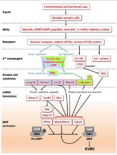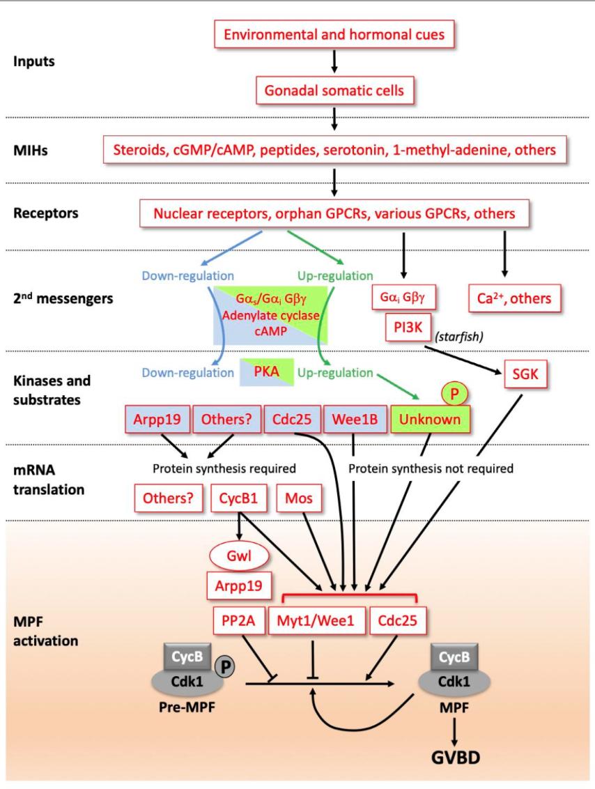 Figure 1. Diverse signalling pathways initiated by maturation initiation hormones (MIHs) lead to a universal biochemical core, activating maturation promoting factor (MPF). Due to the diversity of molecular pathways controlling the resumption of meiosis, this scheme is not exhaustive but is based on a few examples among those studied. MIHs are released from somatic cells near the oocyte (follicle cells, ectoderm cells or others) in response to hormonal (luteinizing hormone (LH) in vertebrates or gonad-stimulating substance (GSS) in starfish) and environmental inputs (dark/light transition, temperature, sea water, etc.). MIH molecules have different identities between species, and the types of receptors mediating the MIH action are also diverse; see text for details. In amphibian and fish oocytes, steroids recruit canonical nuclear receptors unusually associated with membranes in oocytes, but also progestin-specific membrane receptors most probably acting through Gαi and Gβγ. MIH receptor activation leads either to the downregulation of adenylate cyclase, a decrease in cAMP level and PKA activity in vertebrates, or the opposite regulation in various species of hydrozoans or nemerteans. In vertebrates, PKA substrates dephosphorylated following the drop in PKA activity include Arpp19 in Xenopus, Cdc25 in Xenopus and mouse, and Wee1B in mouse. PKA substrates remain to be identified in species where PKA activity increases. In starfish, the dissociation of Gαi from Gβγ activates phosphoinositide 3-kinase (PI3K) which leads to serum- and glucocorticoid-regulated kinase (SGK) activation, independently of cAMP and PKA. In other species, cytoplasmic calcium release is critical in the pathway. In many vertebrate oocytes, the drop in PKA activity indirectly activates the synthesis of new proteins required for MPF activation, such as Cyclin B1 and, in Xenopus, the kinase Mos. In many other species, MPF is activated without the need for new synthesized proteins. The final step of MPF activation (orange box) is common to all animals. Cyclin B-Cdk1 is activated by Cdk1 dephosphorylation at T14 and Y15 due to the reverse of the balance of activities between its regulators, the phosphatase Cdc25 and the kinases Wee1/Myt1. This activation is accelerated by an auto-amplification loop. In parallel, the Cdk1 opposing enzyme, the PP2A phosphatase, is inhibited by Arpp19 phosphorylated by the kinase Greatwall (Gwl). |