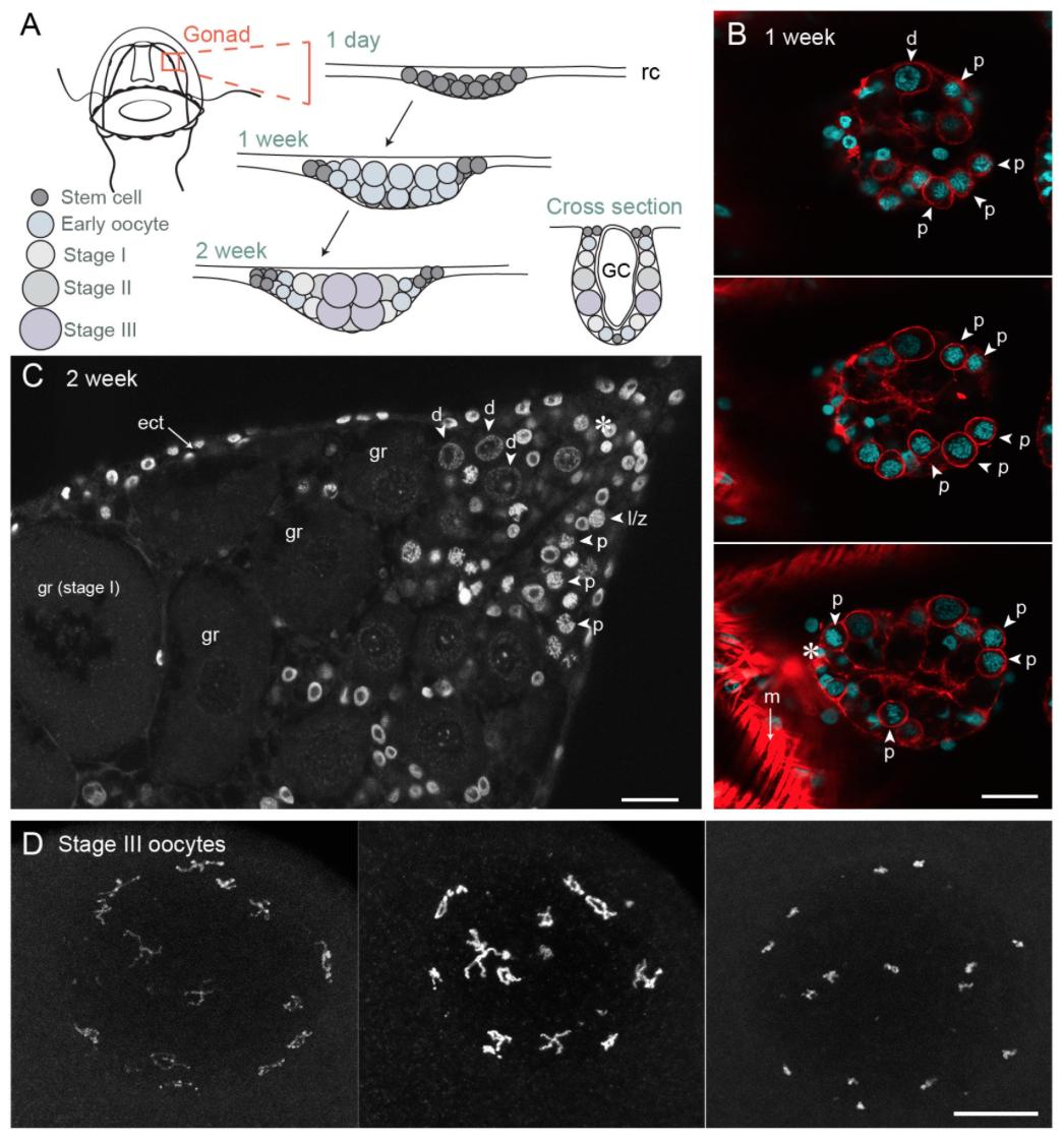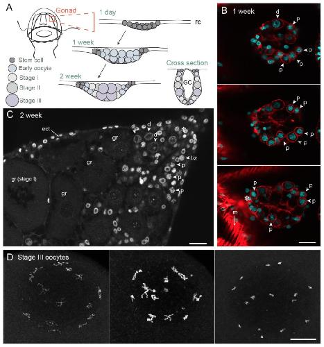 Figure 4. Gonad development and oocyte growth in Clytia hemisphaerica. (A) Schematic of gonad development in 1-day jellyfish (newly released from a polyp specialised for budding called the gonozooid), one-week and two-week old jellyfish; (B) Confocal image through the gonad of one-week old jellyfish, three different z planes; cyanâHoechst (DNA), redâphalloidin (actin). In the bottom section, strong phalloidin staining of a surrounding fold of bell muscle is visible (m); (C) Gonad of two-week-old jellyfish, single confocal z plane. GreyâHoechst (DNA). (D) Maximum projection of fully-grown Stage III oocytes at different stages of chromatin compaction. The fifteen pairs of homologous chromosomes, linked by chiasmata, are dispersed throughout the nucleus, mostly adjacent to the nuclear envelope. GreyâHoechst (DNA). Asterix indicates possible stem cells. Arrows indicate different meiotic stages in early oocytes. Abbreviations: ectâectoderm, GCâgastric cavity, rcâradial canal, grâgrowing oocyte, l/zâleptotene/zygotene stage oocyte, pâpachytene stage oocyte, dâdiplotene stage oocyte, mâmuscle. Scale bars all 20 µm. |