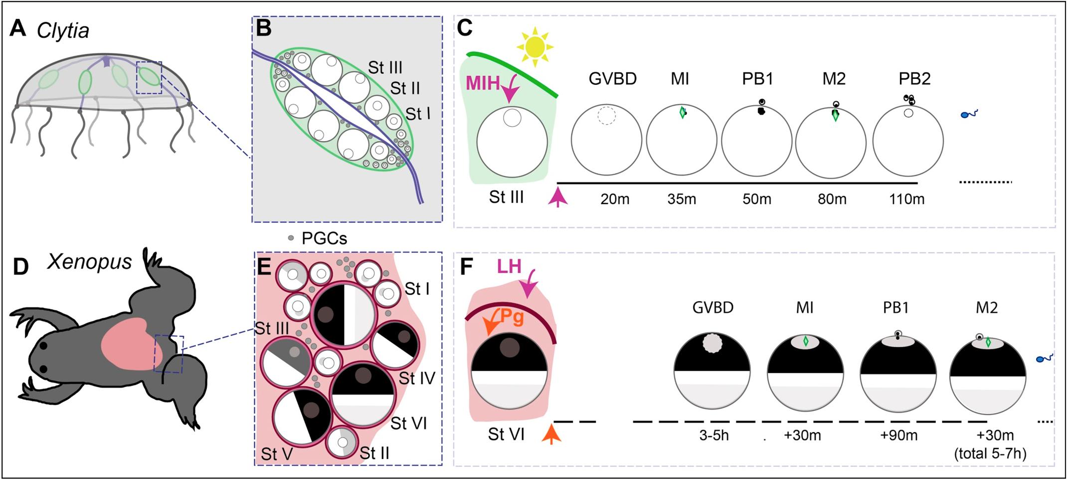 Figure 2. Overview of oocyte growth and maturation in Clytia and in Xenopus. (A) In Clytia adult jellyfish, oocytes develop throughout adult life in the four gonads (green), situated on each of the radial gastrovascular canals connected to the central feeding organ (blue). (B) Stage I, II and III growing oocytes are sandwiched between an outer ectoderm and the endodermal layer of the central gastric cavity, which directly provides nutrients for growth. (C) A darkâlight transition each dawn causes MIH to be released from specialised cells of the gonad ectoderm. MIH acts on an oocyte GPCR leading to MPF activation, manifest as Germinal Vesicle Breakdown (GVBD), then completion of meiotic divisions MI and M2, with the emission of polar bodies PB1 and PB2, before spawning as a G1 unfertilised egg after about two hours. (D) In the adult Xenopus ovary (pink), the meiotic cycle of oocytes is also arrested at diplotene of the first meiotic prophase. (E) Growing oocytes of Stages I-VI are tightly surrounded by one layer of follicle cells and a theca (blood vessels, collagen, fibroblasts) (magenta). (F) Ovulation is triggered by Luteinising hormone (LH) from the pituitary, which causes follicle cells to release steroid hormones, including progesterone (Pg). These act on oocyte membrane receptors to initiate a series of events culminating with variable timing in GVBD and completion of the first meiotic division before arrest as an unfertilised egg at M2 after a total of around 5â7 h. |