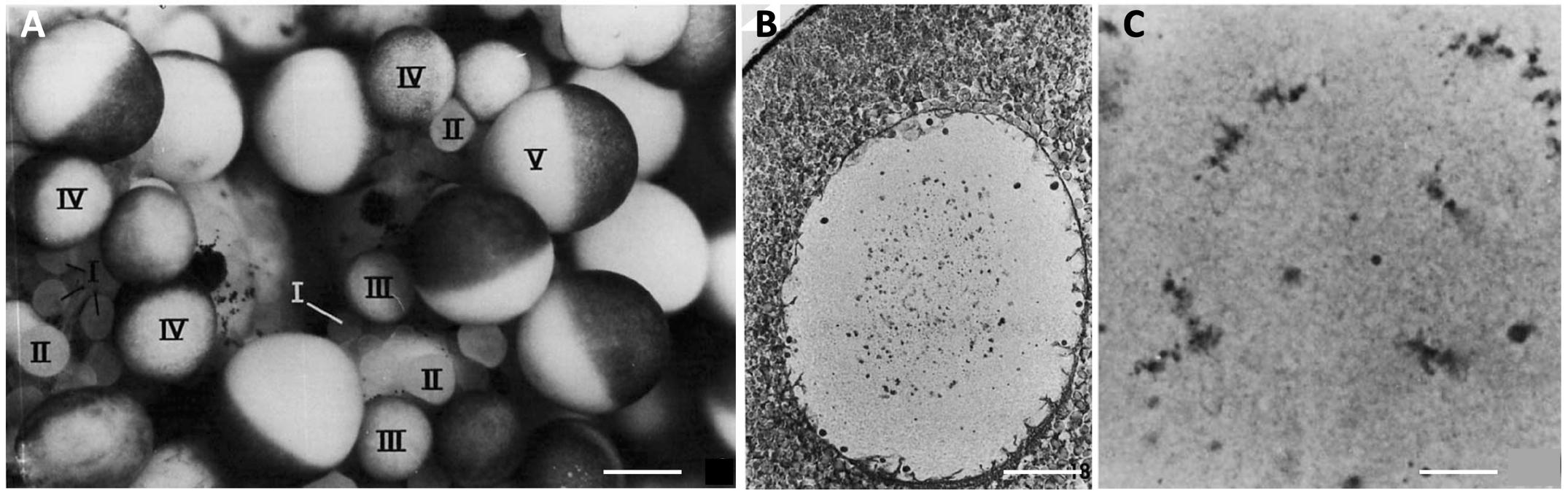 Figure 3. Oocyte growth in Xenopus laevis. (A) A portion of the ovary from a recently ovulated female. Oocytes at successive stages of growth are indicated by Roman numerals. Note the absence of fully-grown Stage VI oocytes (characterised by a completely unpigmented equatorial band), which were ovulated. Scale bar 0.5 mm. (B) Micrograph of a paraffin section of a Stage V oocyte, hematoxylin and eosin staining. The animal pole of the oocyte is at the top left of the micrograph. Chromosomes and small nucleoli condense at the center of the nucleus. Scale bar 14 μm. (C) Micrograph of a paraffin section of a Stage VI oocyte showing the condensed lampbrush chomosomes. Scale bar 1.8 μm. The images were reproduced with permission (license number 4818271464898) from J.N. Dumont, Journal of Morphology; published by John Wiley and Sons, 1972 [61]. |